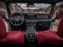 تتميز المقصورة الأنيقة في سيارة رانجلر الجديدة بالوظائف والتقنيات المبتكرة، بالإضافة إلى سمات جيب وتعدد الاستخدامات. تم تصميم لوحة التجهيزات المركزية مستوحاة من الإرث العريق لجيب، بتصميم منحوت بلون أبيض يتكامل مع لوحة التجهيزات الأمامية الأفقية. وتمتاز لوحة العدادات المغلفة بأسطح مبتكرة ملساء مصنوعة من القماش أو البولي يوريثين مع درزات تزيينية متباينة، بينما يوجد جهاز تثبيت الأجهزة أعلى لوحة التجهيزات الأمامية.