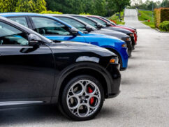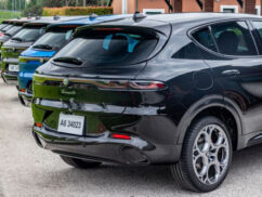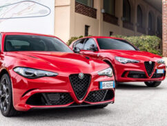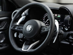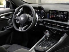 The Veloce model includes all Ti features, plus a dark Miron-colored ‘V’-shaped front frame, Veloce badge, matte side and front trim elements, glossy black window frames, 19-inch Diamond finish alloy wheels with a single-color Alfa Romeo logo center cap, red Brembo calipers, aluminum door sills, aluminum gear shift paddles mounted on the steering column, fully electric black leather seats with ventilation, and the Alfa Dual Stage Valve suspension system for enhanced driving dynamics.