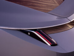 The roof features an electrochromic glass panel that instantly changes color and transparency. The client asked the designers at Coachbuild to develop glass that would harmonize with the Amethyst Droptail’s palette. In response, they engineered a unique dynamic effect: when deactivated, the glass appears fully opaque with a soft purple tone matching the car’s body. With a single touch, it turns transparent, adopting the same shade as the leather used in the interior cabin.